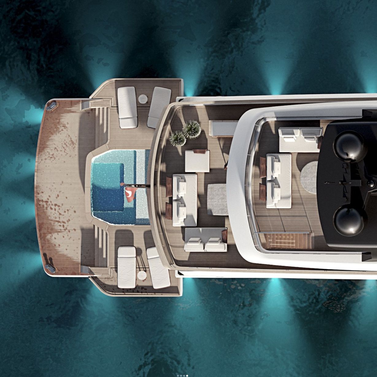 The patio is bathed in natural light streaming in from above and through mullion-less windows set into a stark white hull. On the larger models, this exclusive retreat includes a personal Jacuzzi and steps leading to a lounge area on the main deck.